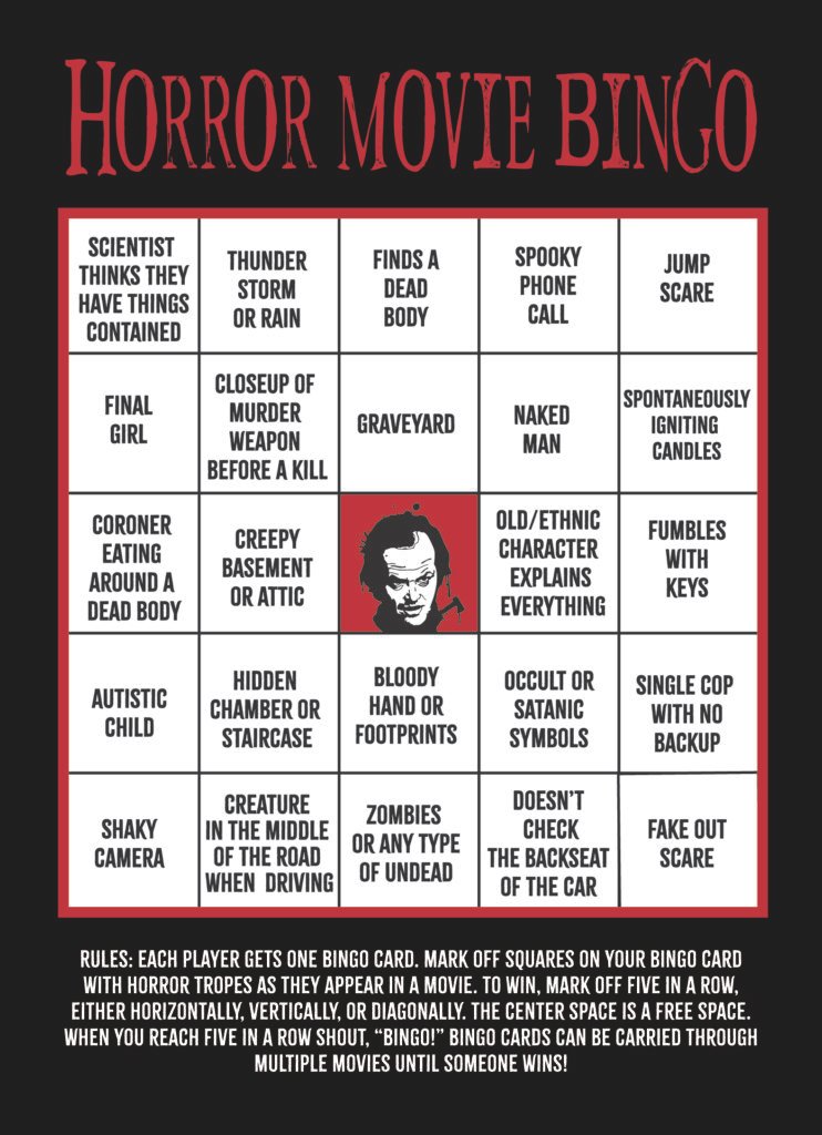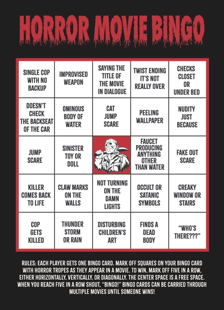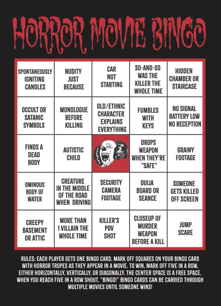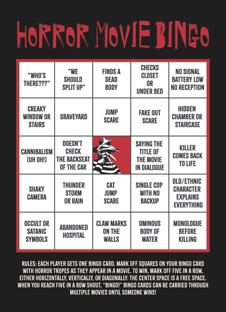 Sometimes I just want to play bingo when I’m watching horror movies, so now I can. All of the character images are clipart, so I cannot add credits to them. If one belongs to you let me know and I’ll either add credit or take it down. This one was just for fun.