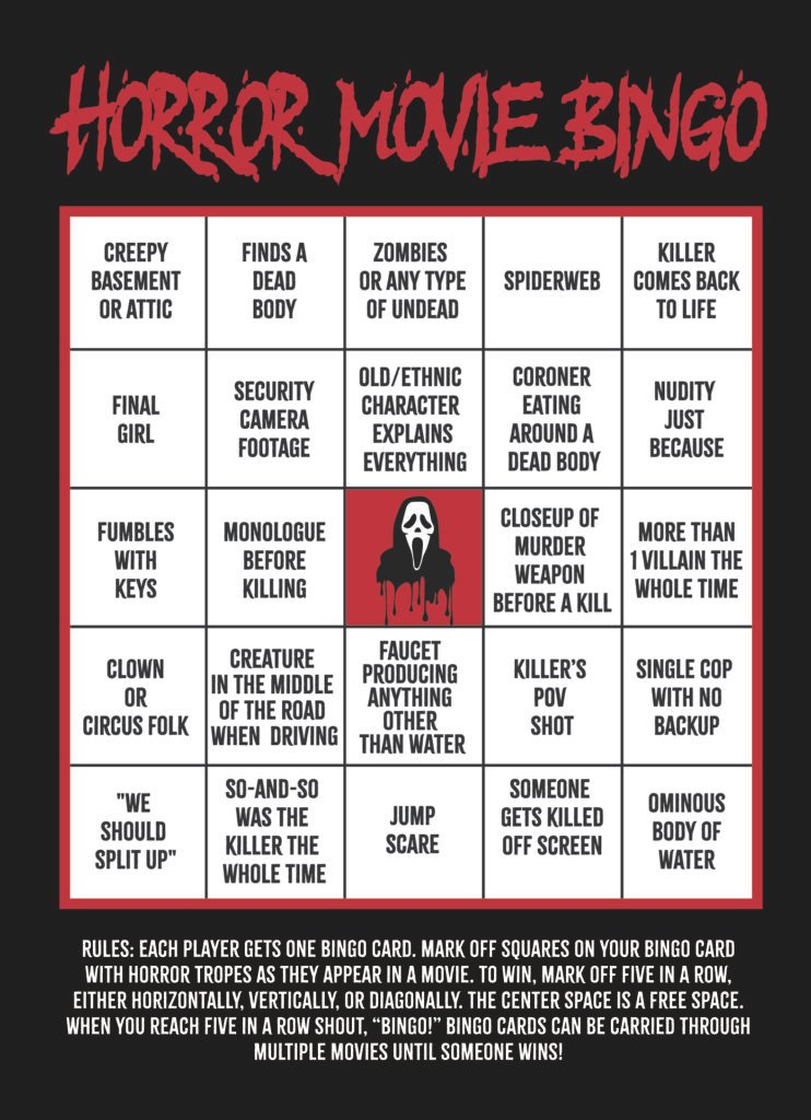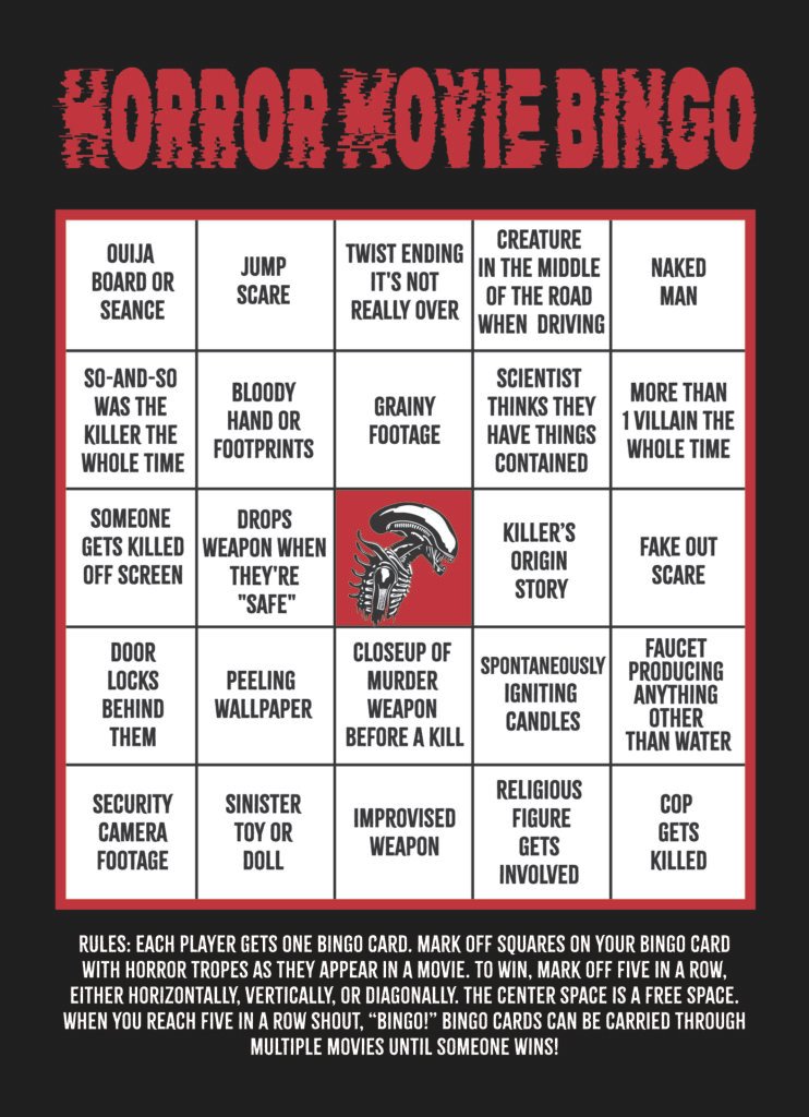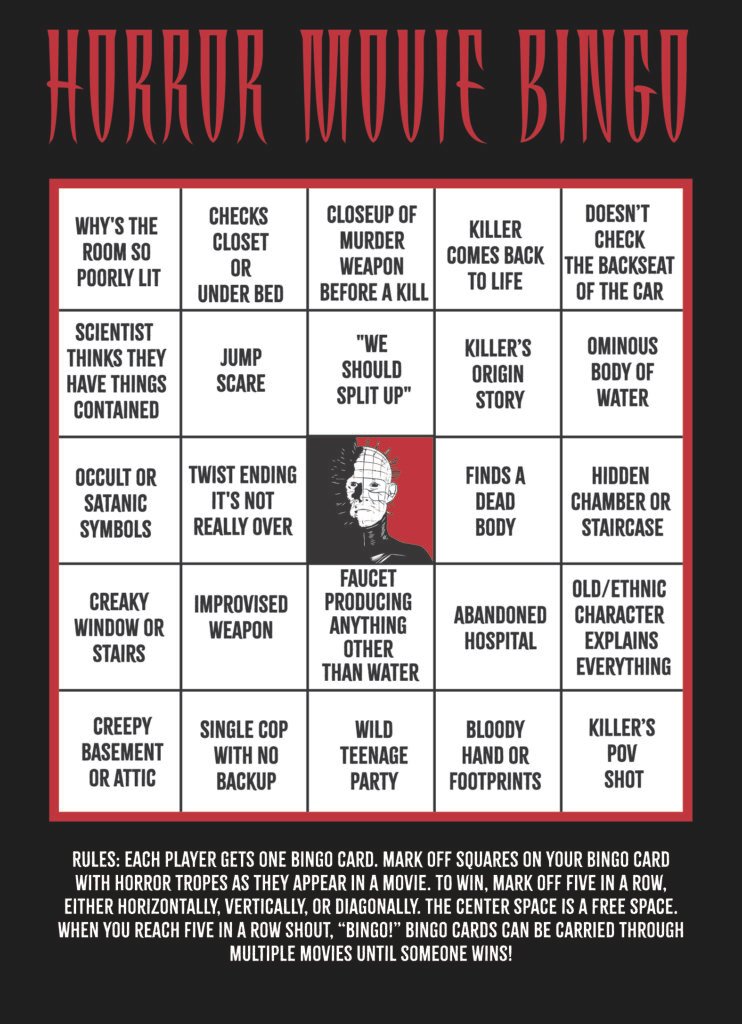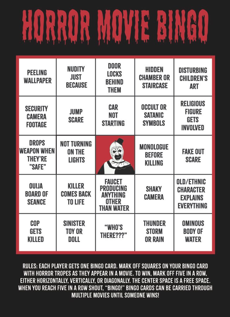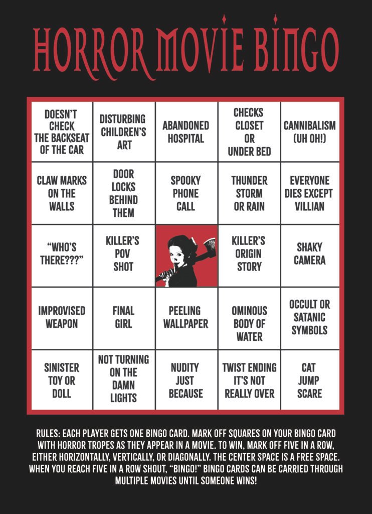 Sometimes I just want to play bingo when I’m watching horror movies, so now I can. All of the character images are clipart, so I cannot add credits to them. If one belongs to you let me know and I’ll either add credit or take it down. This one was just for fun.