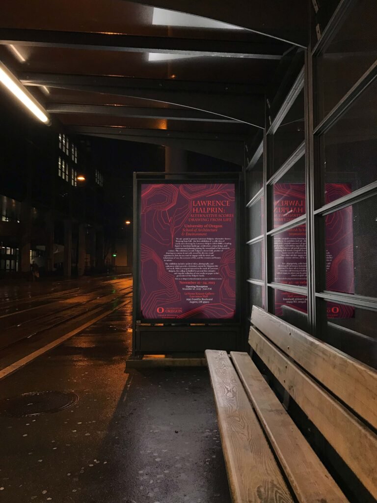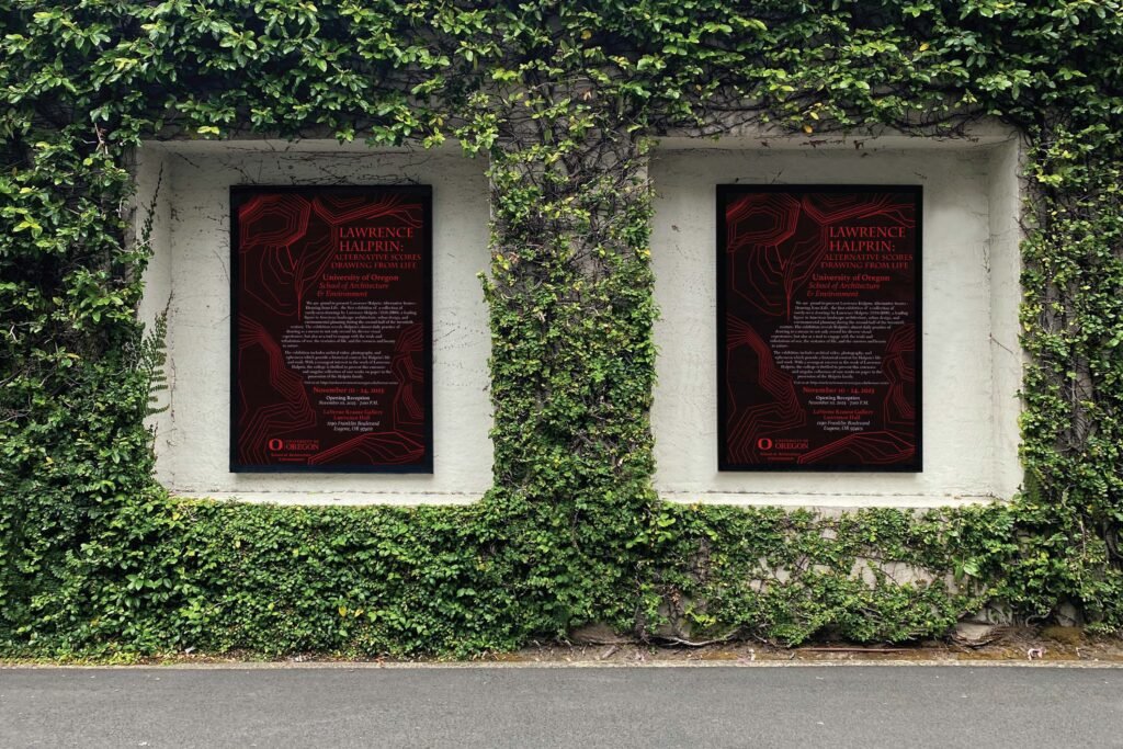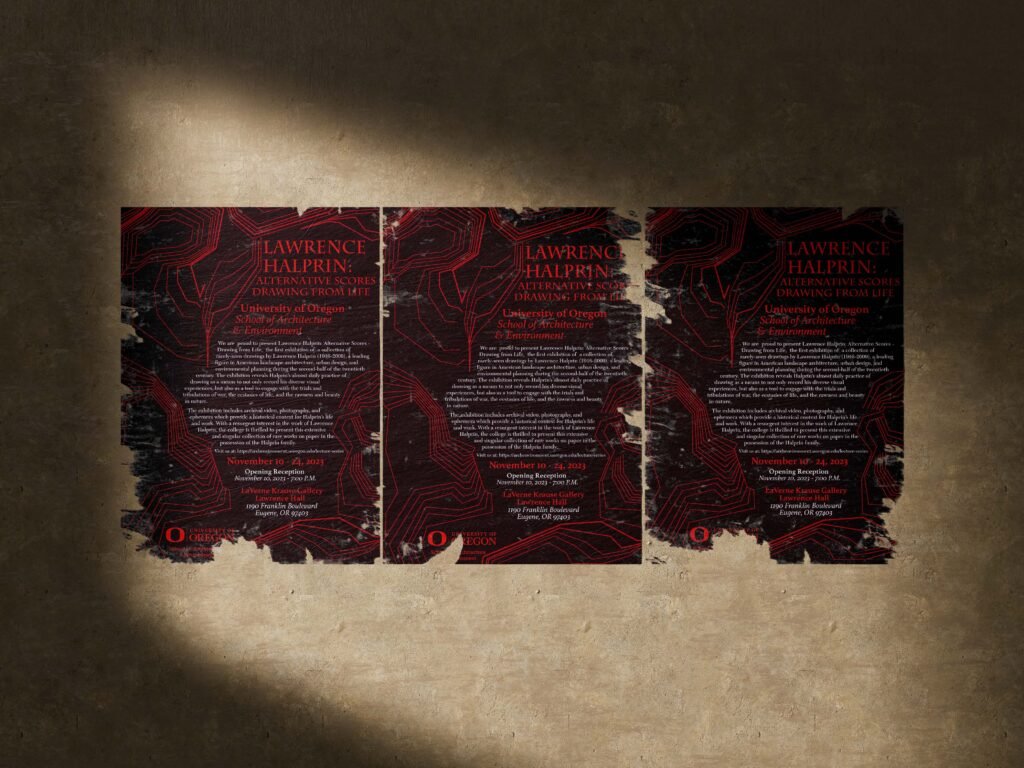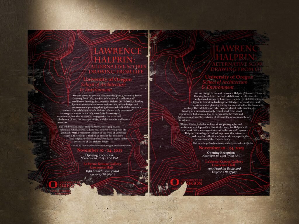 The challenge was to create a poster that not only announced the lecture, but also honored Halprin’s groundbreaking work in landscape architecture. The design needed to capture the essence of his innovative designs for public parks and spaces, while standing out in various environments.